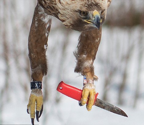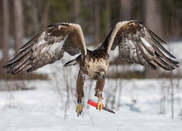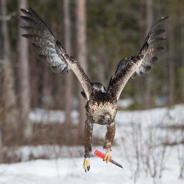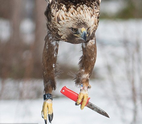 Ο χρυσαετός το είδε και το άρπαξε… Η συνέχεια της ιστορίας δίνεται από τα λόγια του ίδιου του φωτογράφου: «Καθώς πετούσε μακριά είδα κάτι κόκκινο στα νύχια του και τράβηξα μερικά φωτογραφίες. Στην οθόνη της μηχανής είδα ότι πρόκειται για το μαχαίρι που χρησιμοποιήσαμε για να κόψουμε κρέας. Σίγουρα το είχαμε αφήσει στο χιόνι».