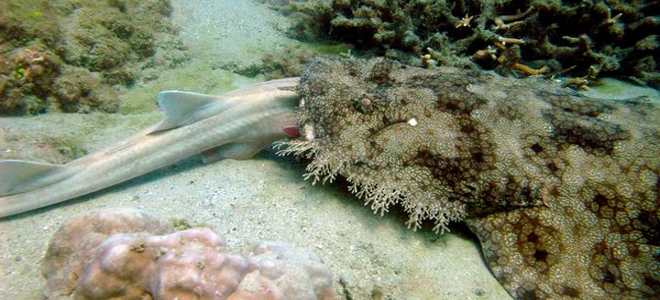 Αντιμέτωποι με ένα πρωτόγνωρο και παράξενο θέαμα ήρθαν οι ερευνητές Ντανιέλα Κεκαρέλι και Ντέιβιντ Γουίλιαμσον από το ερευνητικό ινστιτούτο της Αυστραλίας για τους κοραλλιογενείς υφάλους, όταν εντόπισαν έναν καρχαρία του είδους Eucrossorhinus dasypogon να τρώει έναν καρχαρία μπαμπού (Hemiscyllium ocellatum), στον Μεγάλο Κοραλλιογενή Ύφαλο της Αυστραλίας.