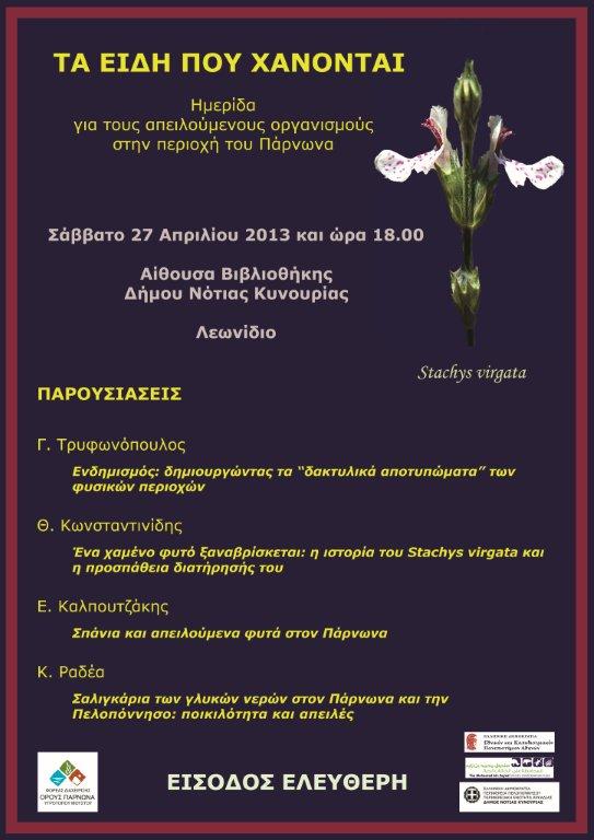 - σε ορισμένα από τα σπανιότερα και περισσότερο απειλούμενα φυτά του Πάρνωνα. Η σημασία της ευρύτερης περιοχής του Πάρνωνα είναι ιδιαίτερη και νέα είδη φυτών εξακολουθούν να ανακαλύπτονται μέχρι σήμερα. Τα είδη που κινδυνεύουν μπορούν να διατηρηθούν στον τόπο όπου φύονται αν ληφθούν κατάλληλα (και συνήθως απλά) μέτρα προστασίας. Η παρουσίαση θα πραγματοποιηθεί από τον κ. Ελευθέριο Καλπουτζάκη, γεωπόνο και διδάκτορα του Πανεπιστημίου Αθηνών.