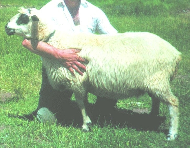 Χρωματισμός λευκός με μελανές κηλίδες στα αυτιά, το στόμα, γύρω από τους οφθαλμούς και τις παρειές του προσώπου. Κεφαλή κωνοειδής, επιρρίνιο κυρτό, αυτιά μεγάλα, ημικρεμάμενα. Κριοί με μεγάλα, ισχυρά κέρατα, ελισσόμενα γύρω από τα αυτιά. Άκρα κοντά. Στήθος μεγάλου βάθους και εύρους. Αναμικτόμαλλο.