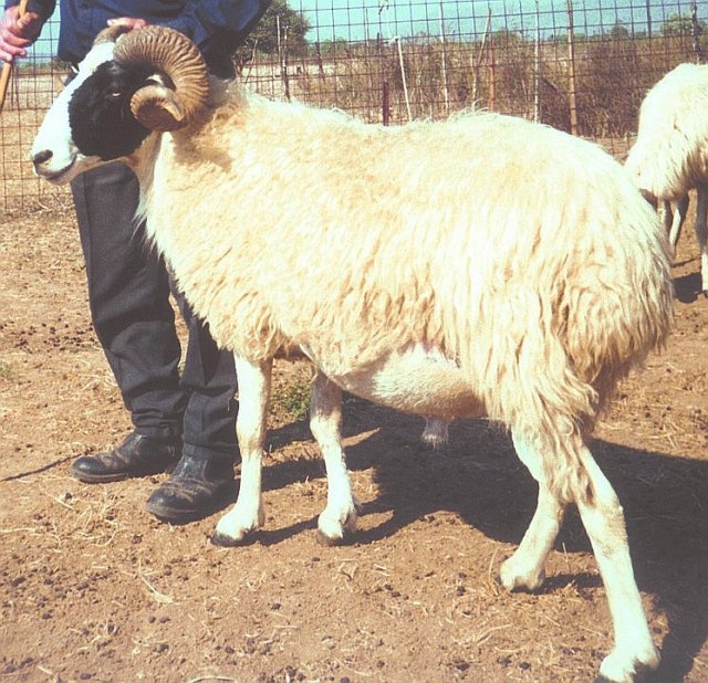 Xρωματισμός σώματος λευκός με μαύρο πρόσωπο και λευκή κορυφή κεφαλής. Άκρα εντελώς λευκά. Κεφαλή μικρή. Επιρρίνιο ελαφρώς κυρτό, αυτιά μεγάλα, ημικρεμάμενα. Κριοί κερασφόροι. Προβατίνες σε ποσοστό 60% με κέρατα σχήματος ημικυκλίου με κλίση προς τη ράχη. Αναμικτόμαλλο. Xαρακτηριστικό σφαιρικό ή σιγμοειδές ή χοανοειδές σχήμα ουράς.