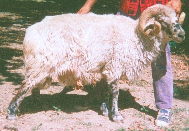 Πλάτος ουράς: 6 cm. Χρωματισμός κυρίως λευκός με φαιόμαυρες κηλίδες στο πρόσωπο, τα μάτια και τα αυτιά. Κεφαλή μετρίου έως μεγάλου μεγέθους, κωνοειδής, χονδροφυής. Επιρρίνιο κυρτό, κοντό, αυτιά μετρίου μεγέθους, πλάγιας διεύθυνσης, ημικρεμάμενα. Κριοί με πολύ ισχυρά κέρατα, ελισσόμενα γύρω από τα αυτιά. Θηλυκά ακέρατα. Άκρα πολύ κοντά, χονδρά και ισχυρά, προσαρμοσμένα σε μακρινές πορείες σε τραχύ έδαφος.