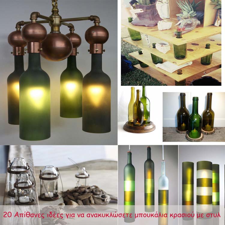 Η ανακύκλωση είναι κάτι πολύ περισσότερο από μια τάση, μπορεί να γίνει τρόπος ζωής. Δημιουργώντας υπέροχα κομμάτια για το σπίτι ή τον κήπο σας από ό, τι δεν χρησιμοποιείται και μπορεί να χαρακτηριστεί ως σκουπίδια είναι ένας πολύ καλός τρόπος για να αναδείξετε το δημιουργικό ταλέντο σας. Τα μπουκάλια κρασιού είναι τέλεια για την ανακύκλωση και μπορεί να γίνουν πολλά θαυμάσια πράγματα, περισσότερο από ό, τι οι περισσότεροι άνθρωποι θα μπορούσαν ποτέ να φανταστούν. Εδώ έχουμε σήμερα για σας ιδέες με καινοτόμους τρόπους για την ανακύκλωση των εν λόγω γυάλινων φιάλων.