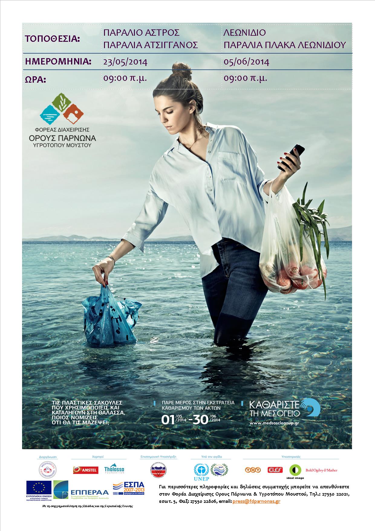 Ο Φορέας Διαχείρισης Όρους Πάρνωνα & Υγροτόπου Μουστού θα συμμετάσχει για 6η συνεχόμενη χρονιά στην πανελλαδική εκστρατεία εθελοντικών καθαρισμών ακτών, βυθού και άλλων φυσικών περιοχών «Καθαρίστε την Μεσόγειο» που πραγματοποιείται από το διάστημα 01 Μαΐου έως 30 Ιουνίου 2014, σε διάφορες περιοχές της χώρας, υπό τον συντονισμό του Δικτύου ΜΕΣΟΓΕΙΟΣ SOS. Η φετινή εκστρατεία επικεντρώνει στην ειδικότερη ανάδειξη του προβλήματος της πλαστικής σακούλας μεταφοράς και συσκευασίας μιας χρήσης στη θάλασσα και τις ακτές.
