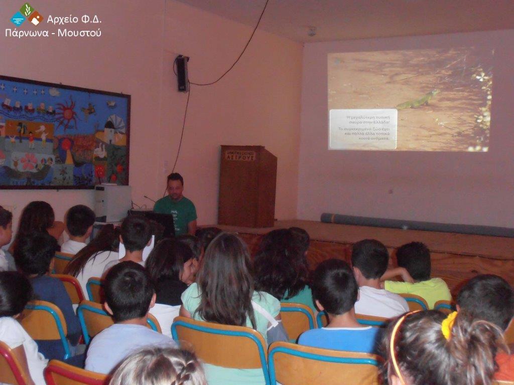 Την ίδια μέρα στη συνέχεια και με αφορμή την Παγκόσμια Ημέρα των Ζώων (4/10), προβλήθηκε στο Σχολείο παρουσίαση περιβαλλοντικής ενημέρωσης, με θέμα «Ζώα που απαντούν στη προστατευόμενη περιοχή όρους Πάρωνα και υγροτόπου Μουστού». Η επίσκεψη έγινε ταυτόχρονα σε όλες τις τάξεις, ανά ομάδες των δύο, από τέσσερα στελέχη του Φορέα Διαχείρισης με τη συμμετοχή των δύο εθελοντών της Ευρωπαϊκής Εθελοντικής Υπηρεσίας.