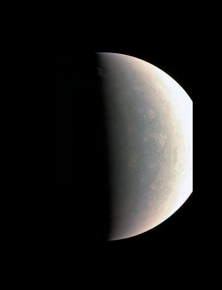 Το σκάφος έκανε το πρώτο κοντινό πέρασμά του από τον Δία (θα ακολουθήσουν άλλα 35), κατεβαίνοντας σε ύψος περίπου 4.200 χιλομέτρων πάνω από τα περιδινούμενα πολύχρωμα πυκνά σύννεφα του πλανήτη.